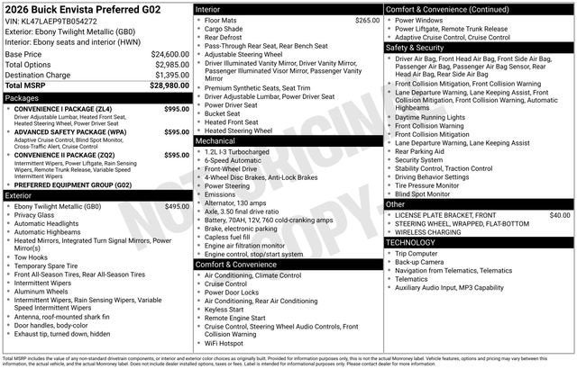 Ebony Twilight Metallic 2026 Buick Envista Preferred FWD 6-Speed Automatic ECOTEC 1.2L Turbo This 2026 Buick Envista comes equipped with, Brake assist, Exterior Parking Camera Rear, Premium 6-Speaker Audio System Feature, Rear Parking Sensors, Wheels: 17 Bright Silver Painted Aluminum, Wireless Apple CarPlay/Wireless Android Auto.