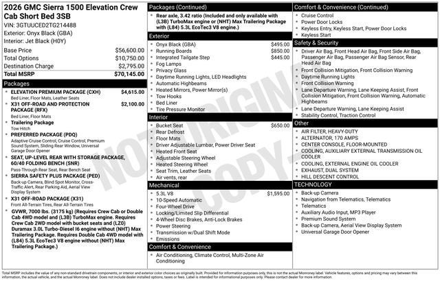 Onyx Black 2026 GMC Sierra 1500 Elevation 4WD 10-Speed Automatic EcoTec3 5.3L V8 This 2026 GMC Sierra 1500 comes equipped with, 10-Speed Automatic, 4WD, Black Leather, High Capacity Suspension Package, Hitch Guidance, Navigation System, Trailering Package.
