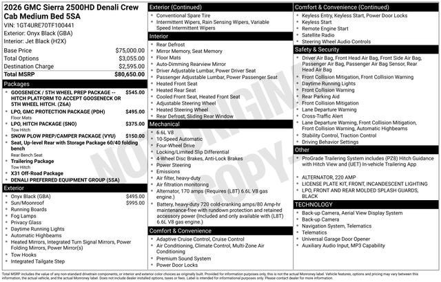 Onyx Black 2026 GMC Sierra 2500HD Denali 4WD 10-Speed Automatic 6.6L V8 This 2026 GMC Sierra 2500HD comes equipped with, 10-Speed Automatic, 4WD, Black Leather, 120-Volt Bed Mounted Power Outlet, 120-Volt Instrument Panel Power Outlet, 2 Charge-Only Rear USB Ports, 2 Charge/Data USB Ports Inside Center Console, 2 USB Ports, 2-Speed Active Transfer Case, 220-Amp Alternator, Bose Premium 7-Speaker Sound System, Deep-Tinted Glass, Electric Rear-Window Defogger, Floor-Mounted Center Console, Front Rain-Sensing Wipers, Gooseneck/5th Wheel Prep Package, HD Surround Vision, Heated 2nd Row Outboard Seats, Hill Descent Control, LED Cargo Area Lighting, LED Smoked Amber Roof Marker Lamps, Manual Tilt-Wheel/Telescoping Steering Column, OnStar Services Capable, Polished Exhaust Tip, Preferred Equipment Group 5SA, Push Button Start, Rear Cross Traffic Alert, Rear Wheelhouse Liners, Remote Vehicle Starter System, Safety Alert Seat, Signature Chrome Denali Grille, Snow Plow Prep/Camper Package, Steering Wheel Audio Controls, Trailer Side Blind Zone Alert, Unauthorized Entry Theft-Deterrent System, Universal Home Remote, Wireless Charging, Wireless Phone Projection, X31 Off-Road Package.