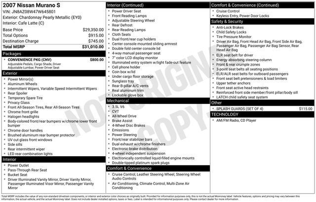 This 2007 Nissan Murano comes equipped with, CVT with Xtronic, AWD. Chardonnay Pearl Metallic 20/24 City/Highway MPGNissan Murano S 4D Sport Utility AWD CVT with Xtronic 3.5L V6 DOHC 24VCome see us at Northtown Automotive in Yankton, SD for a test drive today — Short Drive, Big Savings!Awards:* 2007 KBB.com 10 Best Used SUVs Under $10,000 * 2007 KBB.com 10 Best Used All-Wheel-Drive Vehicles Under $10,000