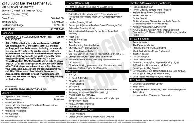 Elevate your driving experience with this stunning 2013 Buick Enclave Leather Group. This luxurious SUV is a true embodiment of style, comfort, and advanced technology, making it the perfect companion for your everyday adventures.Adorned in the captivating Red exterior, this Enclave boasts an impressive array of features that will elevate your driving experience:- 19 Chrome-Clad Aluminum Wheels- Preferred Equipment Group 1SL- 8-Way Power Driver and Passenger Seats with Memory Settings- Power Liftgate- Heated Front Seats- Rear Parking Camera- Side Blind Zone Alert with Cross Traffic AlertStep inside the spacious cabin and immerse yourself in the refined Perforated Leather Seating Surfaces, where comfort and sophistication go hand in hand. The Buick IntelliLink infotainment system provides seamless connectivity, while the Dual-Zone Automatic Climate Control ensures a personalized environment for you and your passengers.Powered by a robust 3.6L V6 engine paired with an All-Wheel-Drive system, this Enclave delivers a dynamic and confident driving experience. With an impressive 22 MPG on the highway, you can enjoy the open road with exceptional fuel efficiency.Whether you're embarking on family adventures or seeking a premium daily driver, this 2013 Buick Enclave Leather Group is the perfect choice. Experience the perfect blend of style, technology, and performance that will elevate your driving experience. Visit our showroom today and let us demonstrate why this Enclave is the SUV you've been searching for.