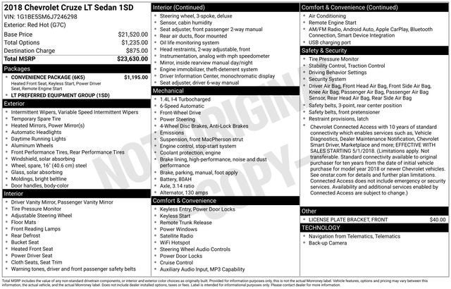 This 2018 Chevrolet Cruze LT is a great choice for efficient, easy everyday driving. It comes with remote start, heated front seats, keyless open & start, and an 8-way power driver seat for added comfort. Finished in Red Hot, it delivers excellent fuel economy at 29/40 MPG and shows extremely low mileage for its age.
