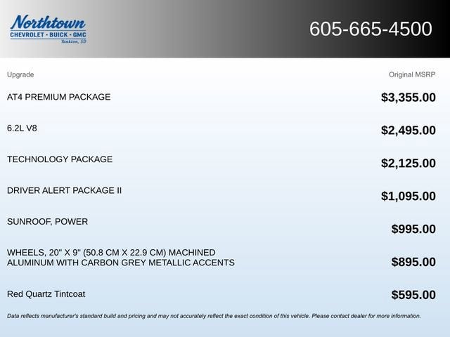 Elevate your driving experience with this stunning 2020 GMC Sierra 1500 AT4. Boasting a powerful EcoTec3 6.2L V8 engine, 10-speed automatic transmission, and 4-wheel drive, this truck delivers an exceptional blend of capability and performance. Adorned in the eye-catching Red Quartz Tintcoat exterior, this Sierra AT4 is a true head-turner.- SUNROOF, POWER- TECHNOLOGY PACKAGE(HD Surround Vision, Rear Camera Mirror, Bed View Camera, Multicolor 15 Diagonal Head-Up Display)- AT4 PREMIUM PACKAGE( Driver Alert Package I, 6 Black rectangular assist steps)- DRIVER ALERT PACKAGE II(Forward Collision Alert, Lane Keep Assist/Lane Departure Warning, Automatic Emergency Braking, Front Pedestrian Braking, Adaptive Cruise Control-Camera, Following Distance Indicator)- Trailer Tire Pressure Monitor System- Premium Bose 7-Speaker Sound System- Radio: Premium GMC Infotainment Sys w/Navigation- SiriusXM w/360L- Universal Home Remote- Perimeter Lighting- High Gloss Black Mirror Caps- 8 Driver Information Center- Bed View Camera- HD Surround Vision w/2 Trailer View Camera Provisions- Lane Change Alert w/Side Blind Zone AlertThis Sierra AT4 is meticulously equipped to elevate your driving experience. The powerful 6.2L V8 engine, paired with a smooth-shifting 10-speed automatic transmission, delivers impressive power and efficiency. The advanced 4-wheel drive system provides exceptional off-road capability, while the premium features and technology keep you connected, entertained, and safe on every journey.The interior of this Sierra AT4 is equally impressive, featuring perforated leather-appointed front seats with heating and ventilation, a heated steering wheel, and a premium Bose audio system. The spacious cabin offers ample room for passengers and cargo, making it the perfect companion for work, play, or adventure.Whether you're tackling tough terrain, towing a heavy load, or simply enjoying the open road, this 2020 GMC Sierra 1500 AT4 is the ultimate choice. Experience the perfect blend of power, capability, and refinement. Visit our showroom today and let us demonstrate how this exceptional truck can elevate your driving experience.Short Drive, Big Savings!