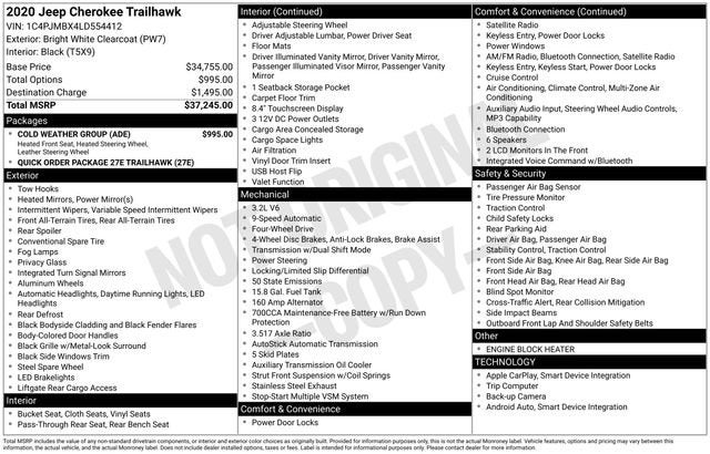 Discover the ultimate SUV adventure with the 2020 Jeep Cherokee Trailhawk. This rugged and capable off-road warrior is ready to take you on the journey of a lifetime, whether you're conquering the trails or navigating the city streets.Equipped with a powerful 3.2L V6 engine and a 9-speed automatic transmission, the 2020 Jeep Cherokee Trailhawk delivers exceptional performance and efficiency, with an impressive 18 MPG in the city and 24 MPG on the highway. Boasting a sleek White exterior, this SUV is not only stylish but also built to withstand the toughest conditions.- Cold Weather Group: Includes Engine Block Heater, Leather Wrapped Steering Wheel, Windshield Wiper De-Icer, Heated Front Seats, Heated Steering Wheel- Radio: Uconnect 4 with 8.4 Display- Apple CarPlay/Android Auto- Heated Steering Wheel- Leather Wrapped Steering Wheel- Heated Front Seats- Windshield Wiper De-IcerThe 2020 Jeep Cherokee Trailhawk is packed with a host of premium features that elevate your driving experience. Enjoy the convenience of remote keyless entry, power windows, and steering wheel-mounted audio controls. Stay connected with the Uconnect 4 system, featuring an 8.4 touchscreen display, Apple CarPlay, and Android Auto integration.Tackle any terrain with confidence thanks to the Trailhawk's off-road-focused capabilities. The Hill Descent Control, 4-Wheel Disc Brakes, and 4-Wheel Independent Suspension ensure a smooth and stable ride, no matter the conditions. With the ParkView Rear Back-Up Camera, parking and maneuvering in tight spaces is a breeze.Safety is of the utmost importance, and the 2020 Jeep Cherokee Trailhawk delivers. Dual front impact airbags, dual front side impact airbags, and an overhead airbag provide comprehensive protection, while features like Electronic Stability Control and Traction Control enhance your overall driving security.Experience the thrill of the open road and the freedom of the great outdoors with the 2020 Jeep Cherokee Trailhawk. Visit our showroom today and let us demonstrate why the Trailhawk is the ultimate choice for your next vehicle.