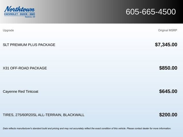 Discover the Exceptional 2021 GMC Sierra 1500 SLT - A Rugged Powerhouse with Uncompromising StyleElevate your driving experience with the remarkable 2021 GMC Sierra 1500 SLT. This impressive truck seamlessly blends exceptional capability, advanced technology, and refined sophistication, making it the ultimate companion for your adventures.Equipped with the robust EcoTec3 5.3L V8 engine and a smooth-shifting 8-speed automatic transmission, the Sierra 1500 SLT delivers impressive power and efficiency. Boasting 4-wheel drive, this vehicle is ready to tackle any terrain, whether you're navigating the city streets or exploring the great outdoors.• SLT PREMIUM PLUS PACKAGE• X31 OFF-ROAD PACKAGE• Cayenne Red Tintcoat Exterior• 275/60R20SL All-Terrain Blackwall TiresExperience the cutting-edge features that set the Sierra 1500 SLT apart:• Premium Bose 7-Speaker Sound System• Radio with Navigation• SiriusXM with 360L• Steering Wheel Audio Controls• Electric Rear-Window Defogger• 12-Volt Rear Auxiliary Power Outlet• 120-Volt Bed Mounted Power Outlet• 120-Volt Instrument Panel Power Outlet• Power Front Passenger Windows with Express Up/Down• Power Rear Windows with Express Down• Remote Vehicle Starter System• Universal Home RemoteElevate your driving experience with the Sierra 1500 SLT's exceptional technology and convenience features. Stay connected with the 4G LTE Wi-Fi Hotspot, enjoy the convenience of Wireless Charging, and let the Adaptive Cruise Control and Advanced Safety features provide added peace of mind on the road.Indulge in the ultimate in comfort and style with the Sierra 1500 SLT's premium leather-appointed seating, heated and ventilated front seats, and heated rear outboard seats. The spacious interior, paired with the convenient features, ensures a truly exceptional driving experience.Whether you're tackling challenging terrain, hauling heavy loads, or simply seeking a refined and capable daily driver, the 2021 GMC Sierra 1500 SLT is the perfect choice. Experience the uncompromising performance, advanced technology, and sophisticated style that this exceptional truck has to offer. Visit our showroom today and let us demonstrate why the Sierra 1500 SLT is the ultimate choice for discerning truck enthusiasts.