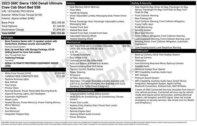 Elevate your driving experience with this exceptional 2023 GMC Sierra 1500 Denali Ultimate. This vehicle is more than just a truck - it's a masterpiece of engineering and design, built to exceed your expectations.Meticulously crafted with a host of premium features, this Sierra Denali Ultimate boasts:- Carbon Fiber Composite Bed- White Frost Tricoat exterior- 16-Way Power Driver and Passenger Seats with Lumbar Support- Heated and Ventilated Front Seats- Heated Outboard Rear Seats- Power SunroofStep inside and be captivated by the Sierra's luxurious interior, featuring genuine wood accents, a Bose Premium Audio System, and a 15-inch Multicolor Head-Up Display. The advanced technology and connectivity options, including Wireless Charging, Apple CarPlay, and Android Auto, ensure you stay seamlessly connected on the road.Powered by the robust EcoTec3 6.2L V8 engine paired with a 10-Speed Automatic transmission, this Sierra Denali Ultimate delivers a thrilling driving experience. With 4-Wheel Drive and a suite of advanced safety features, including Automatic Emergency Braking, Lane Keep Assist, and Rear Pedestrian Detection, you can navigate with confidence, no matter the conditions.Beyond its impressive capabilities, the Sierra Denali Ultimate exudes a refined and sophisticated presence. The striking Carbon Fiber Composite Bed and Vader Chrome Header with Signature Denali Grille create a bold, distinctive look that commands attention.This vehicle is more than just a truck - it's a statement of your discerning taste and unwavering commitment to quality. Experience the difference for yourself and schedule a test drive today. We're confident that once you get behind the wheel, you'll be captivated by the unparalleled performance, comfort, and style of this exceptional 2023 GMC Sierra 1500 Denali Ultimate.