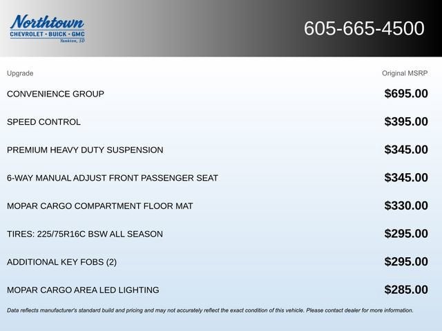 The ProMaster's versatility is further enhanced by its Quick Order Package 22A, which includes the Convenience Group and Premium Heavy Duty Suspension. Standout features like the ParkView Rear Back-Up Camera, Ambient LED Lighting, and Shelf Above Roof Trim make this van a true workhorse, elevating your business operations to new heights.